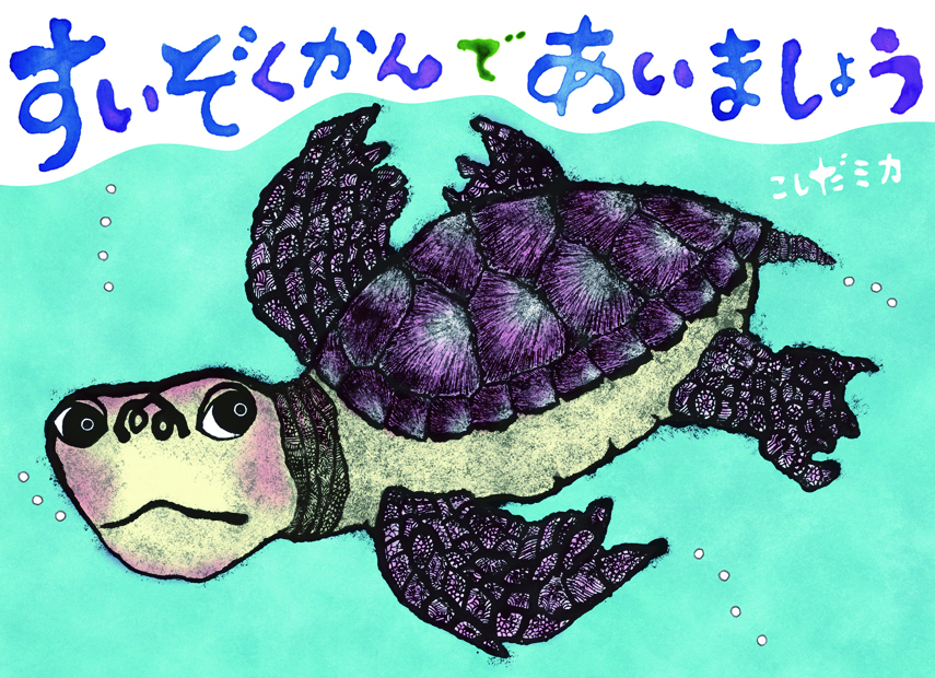 水族館では、水を濾過循環させる機械室で働く人や餌を準備したり魚たちの健康管理したりする人たちがたくさん働いている。本文では、表紙のウミガメのようにダイナミックに誇張された様々な海の生き物たちの見開きごとの絵に、関西弁で彼らの呟きが手書き文字で添えられる。それらの間に水族館の舞台裏の複雑な機械室や、そこで働く人たちの姿や仕事の様子を克明に描き込んだ見開きが挟み込まれる。海の生きものたちのユーモラスな姿と、それを支える人々の日常や機械の構造までもがわかる絶妙な構成と表現が見事だ。(野上)