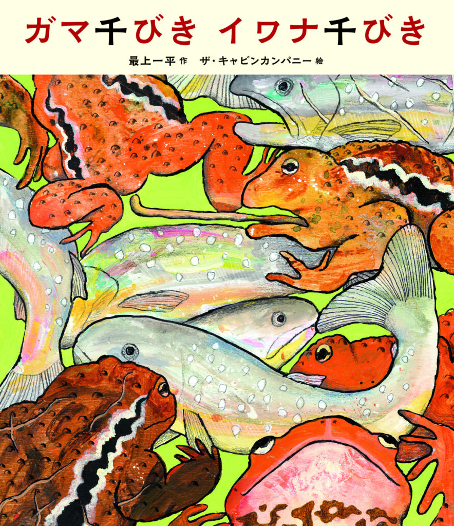 A toad (the Japanese common toad) lives beneath a waterfall. One day, a fish (char) swims along and tries to swim up the waterfall many times with no success. The toad nonetheless admires the fish’s persistence and gets the idea to become a toadfish together. One stormy day, as the fish yearns to “meet a new self” and the water churns, the fish goes up and does not come down. The toad travels by land to reach the top of the waterfall. There, a thousand toads and a thousand fish have gathered. This book pulls readers in with its bold, powerful illustrations of the fish and toad’s expressions, which fill every spread. (KONDO)