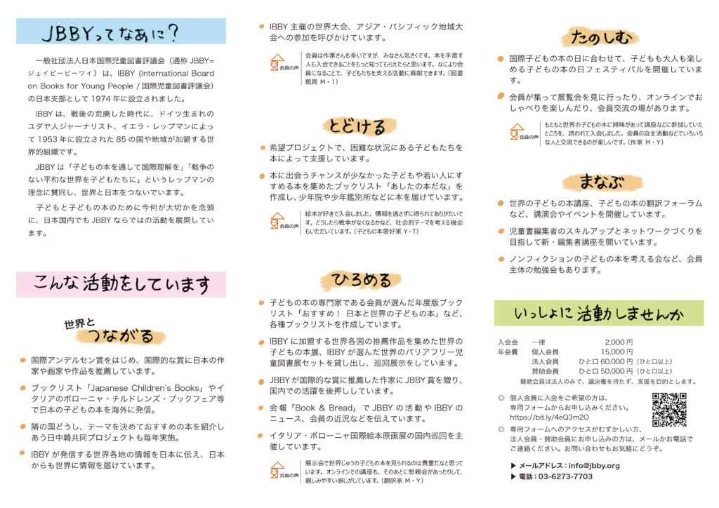 子どもの本に関わる個人、団体、また子どもの本に関心のある方であればどなたでも入会できます。会員になって、子どもたちが安心できる未来のための活動を支えてください。年4回の会報とJBBYが発行するブックリストをお送りします。